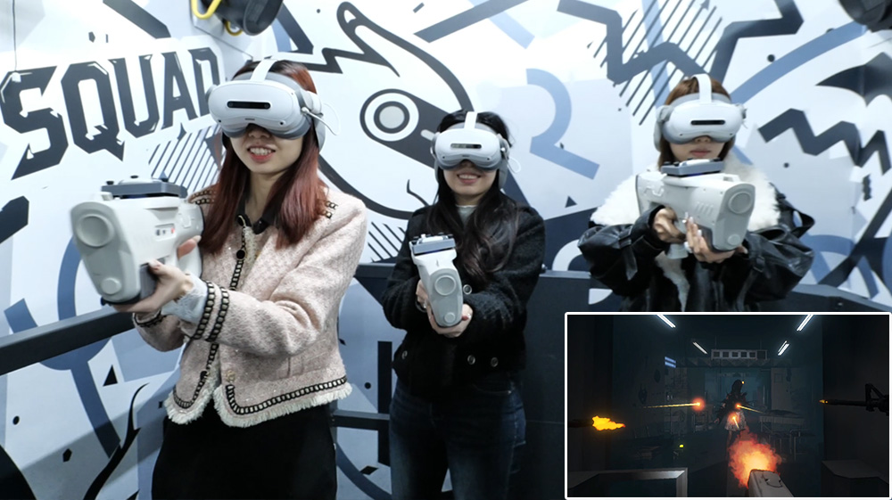 4、用戶無(wú)需背負(fù)沉重設(shè)備,僅需佩戴輕量化頭顯與動(dòng)捕手柄 (科幻槍模),即可在虛實(shí)融合的開放場(chǎng)景中自由行走互動(dòng)